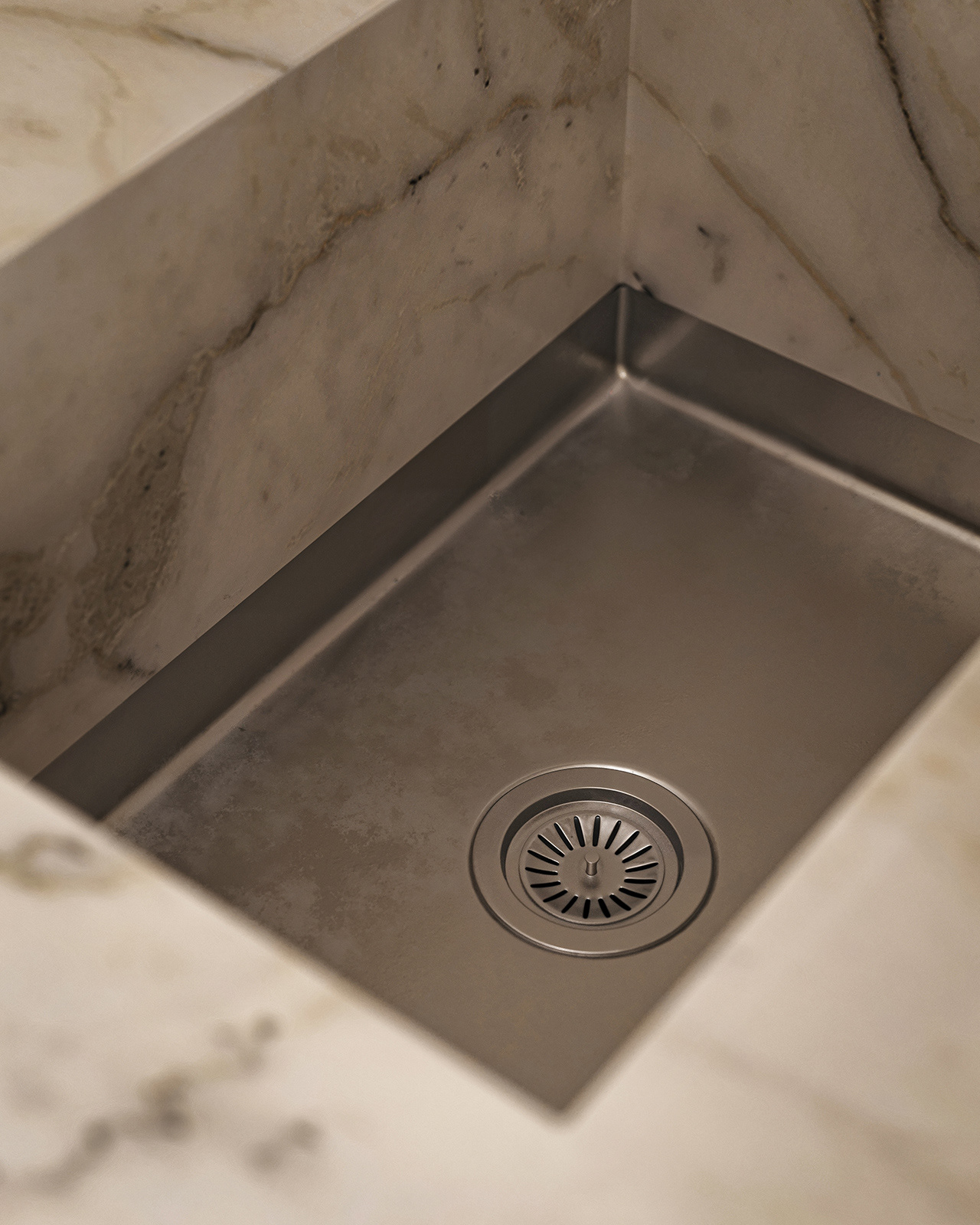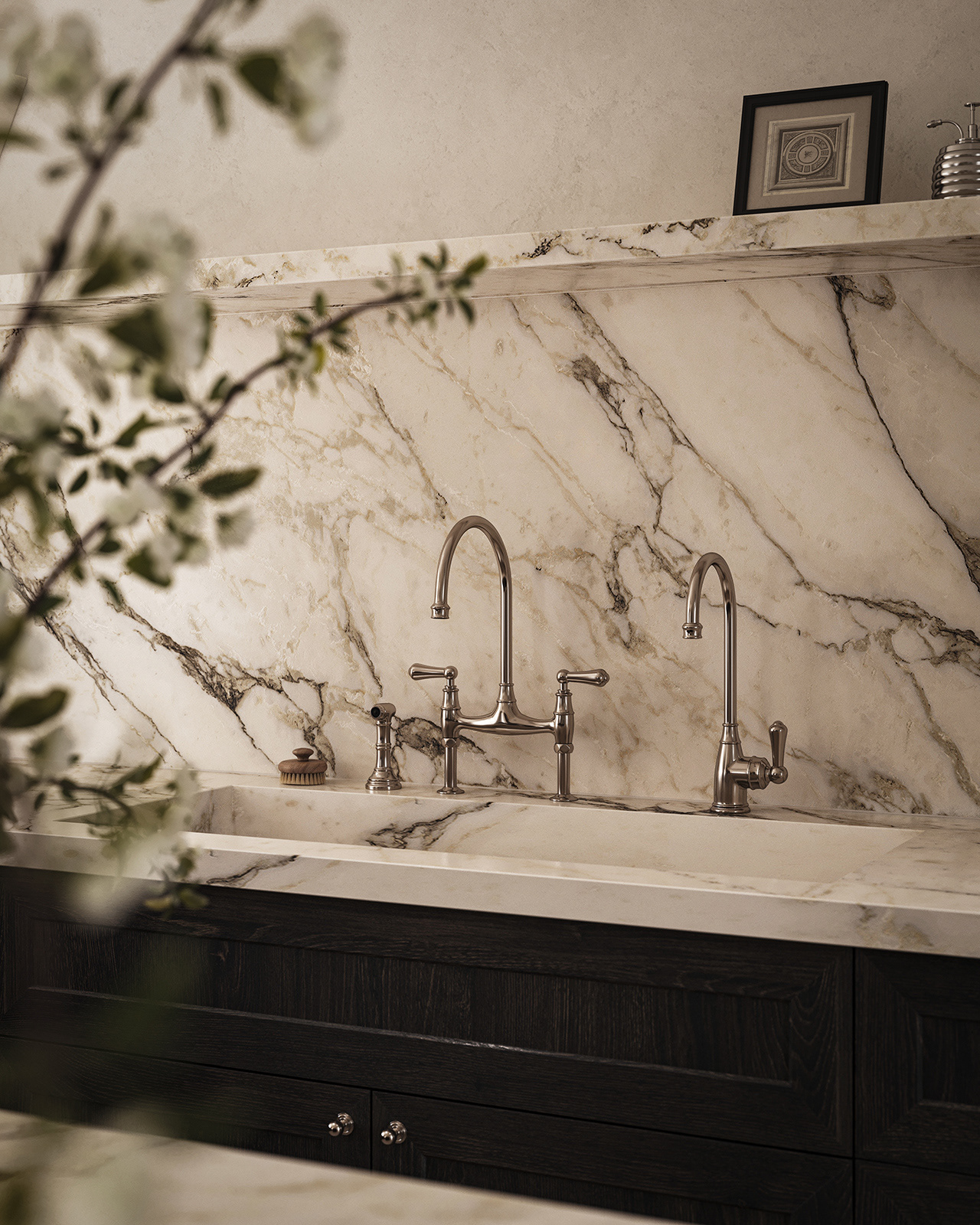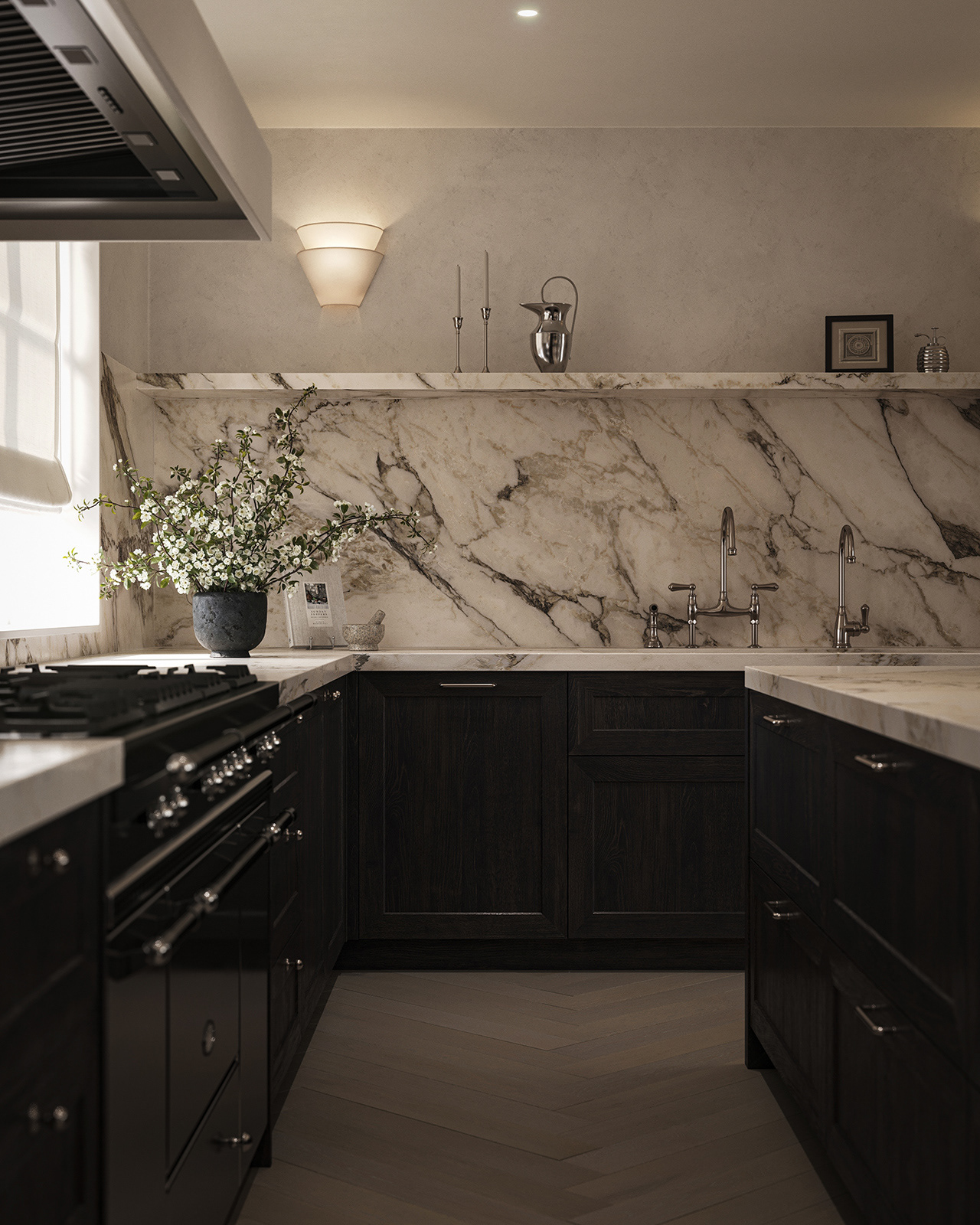 The kitchen is composed in a natural classic mood with dark wood doors and Calacatta slabs.