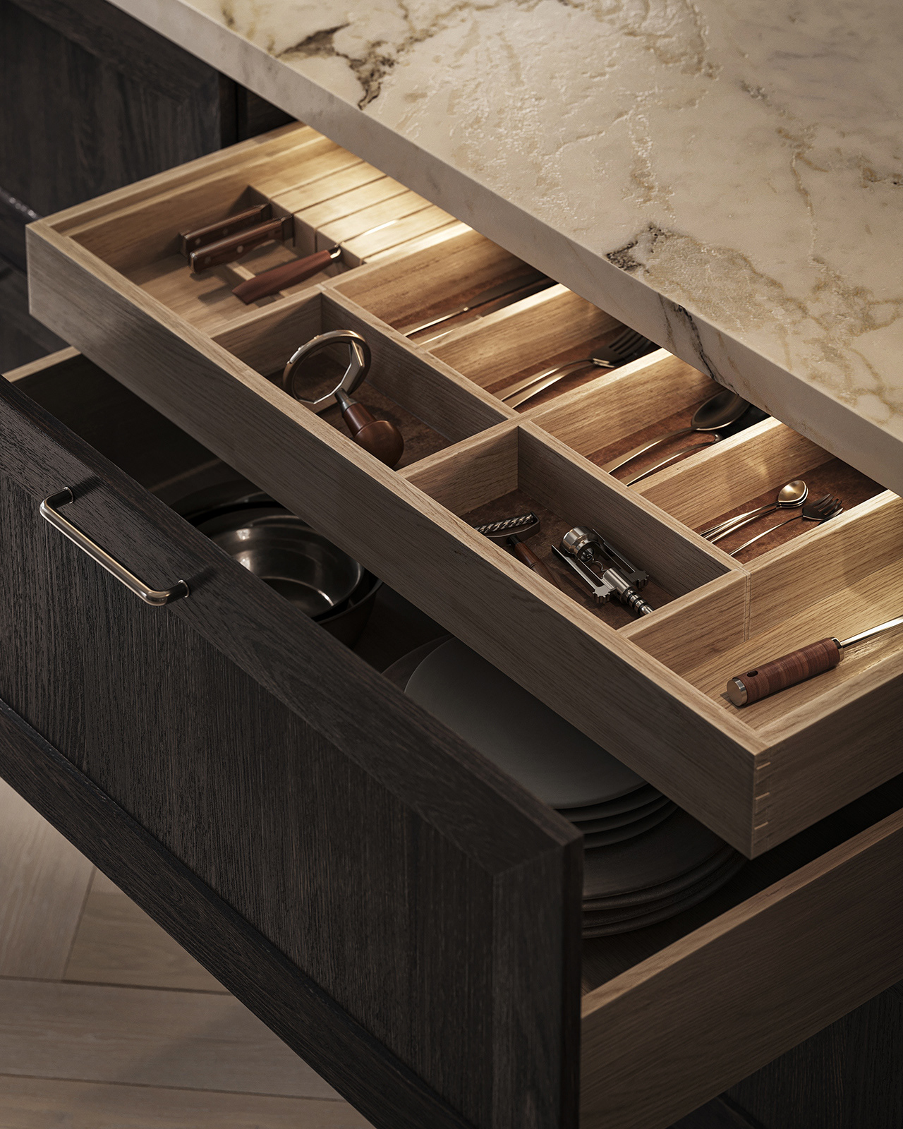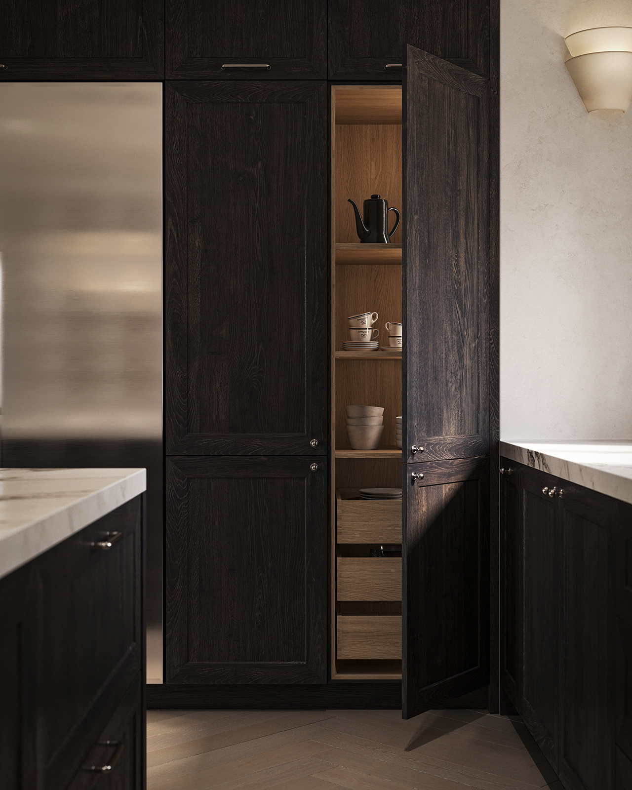 The inner pantry finished in light wood adds contrast and depth to the overall composition.