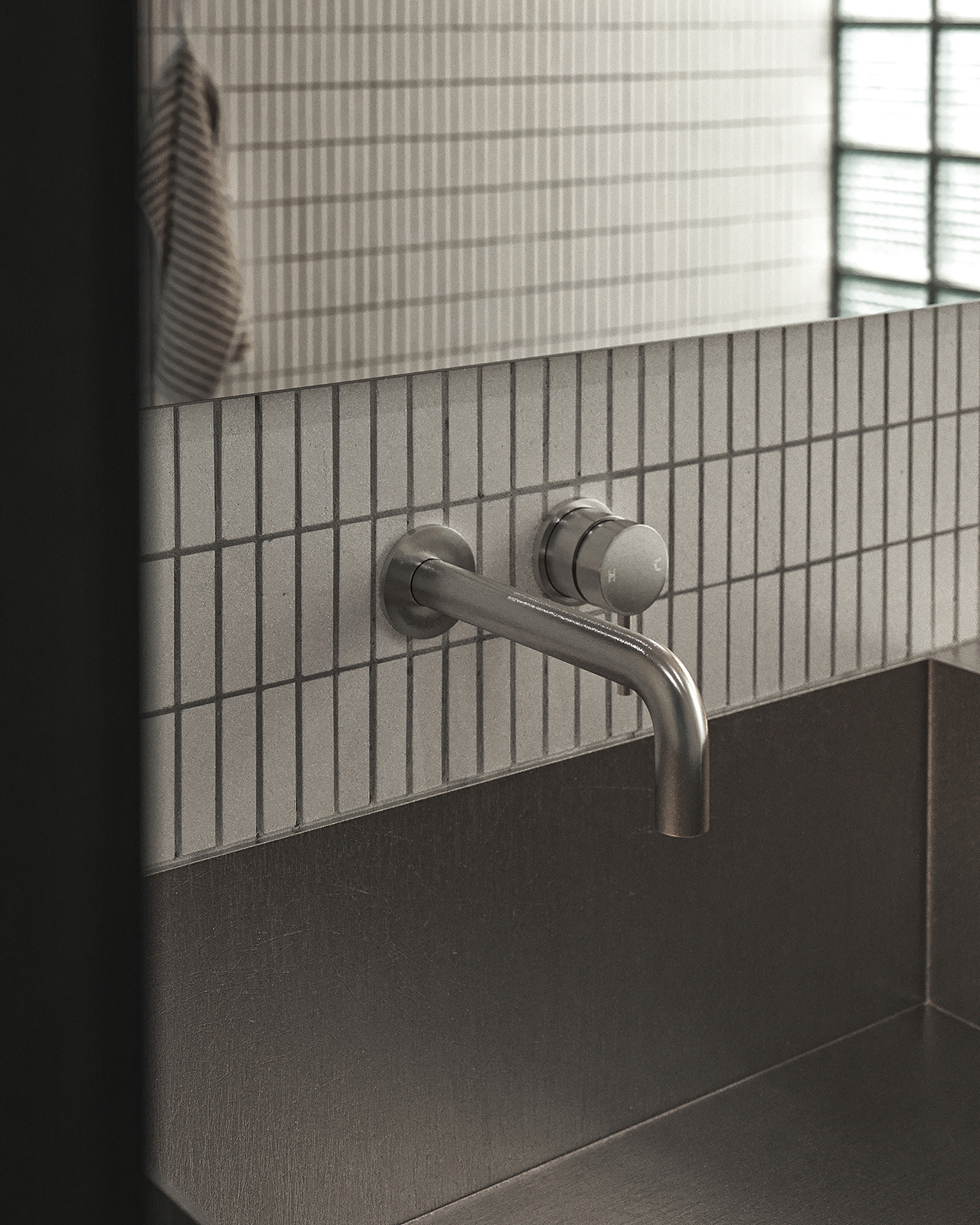 Matching accessories with the stainless steel sink, along with mosaic tiles and the contrast of black and white, add depth and a modern character to the space.