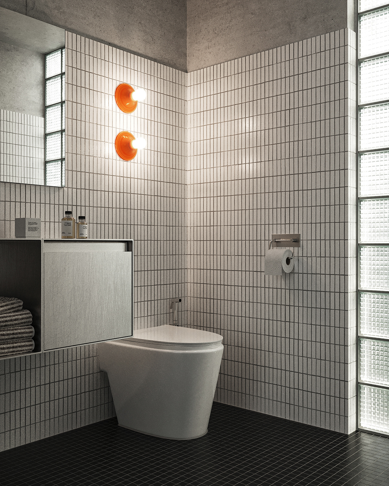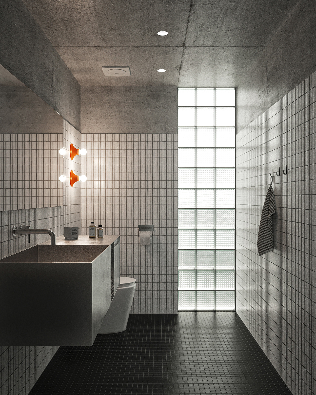 The design elements from the kitchen and dining area were applied to the bathroom to maintain visual continuity throughout the space.